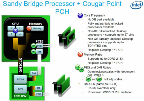 Итак, выпущенный полторы недели назад Z68 действительно позиционируется как старший чипсет для процессоров Sandy Bridge. Однако при этом он продолжает оставаться представителем семейства Cougar Point, а значит, не вносит никаких корректив в общую архитектуру платформы. По этой причине на какие-то изменения в принципах разгона процессора надеяться бесполезно. Наиболее удручающая оверклокеров невозможность увеличения частоты базового тактового генератора (BCLK) — это не простая прихоть Intel, а результат того, что эта частота используется для тактования не только процессора, но и всей периферийной обвязки.