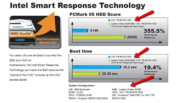 Совершенно очевидно, что технология Intel Smart Response имеет смысл в том случае, когда на быстром кеширующем накопителе уже имеются необходимые данные. То есть она будет эффективна в первую очередь для ускорения загрузки Windows и приложений. В том же случае, когда речь идёт об обработке больших объёмов разных данных, например о видеомонтаже, обработке медиаколлекций и т.п., смысла в кеше будет немного. Особенно досадно то, что дисковый массив с Smart Response-кешем может в некоторых случаях работать даже медленнее, чем тот же массив «в чистом виде». Чтобы этого не происходило, для кеша нужно использовать скоростные SSD с высокой скоростью записи, однако это увеличивает стоимость оборудования, необходимого для включения технологии.