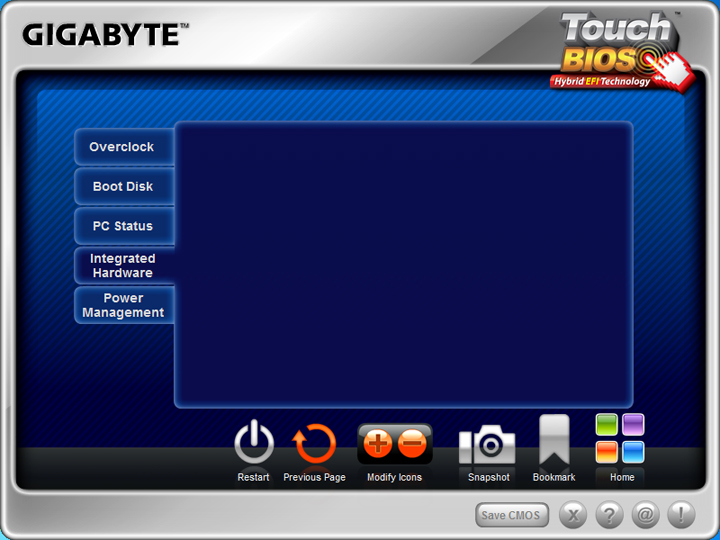 Но первые же попытки воспользоваться Touch BIOS для настройки системы разбиваются о суровую действительность: главная функция данной программы — красивая заставка и не более того. Приятный и понятный внешний вид интерфейса заканчивается на начальном экране. Наполнение подразделов очень скупое, там присутствуют лишь редкие малозначительные опции, а многие разделы вообще пустые.