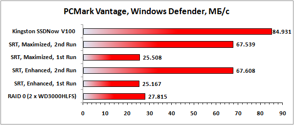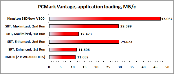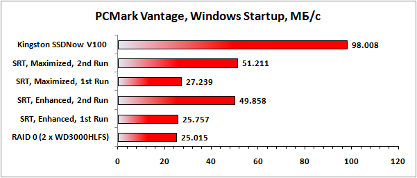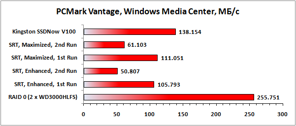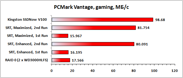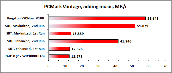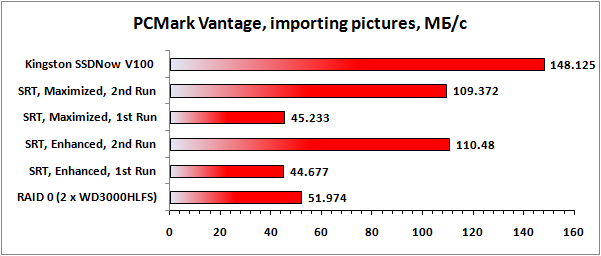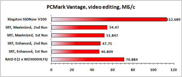 Также мы провели тесты в PCMark Vantage, который создаёт более реальную нагрузку на дисковую подсистему. В системе с активированной технологией Intel Smart Response тест проводился дважды. Это позволило оценить производительность в том случае, когда необходимые данные в SSD-кеше отсутствуют, и тогда, когда уже находятся там.