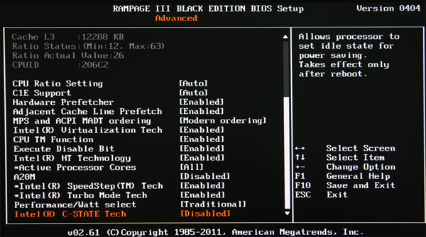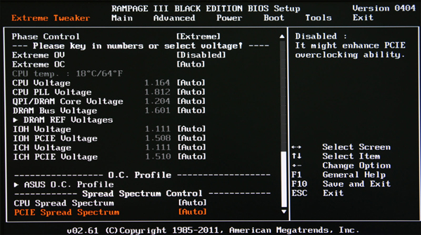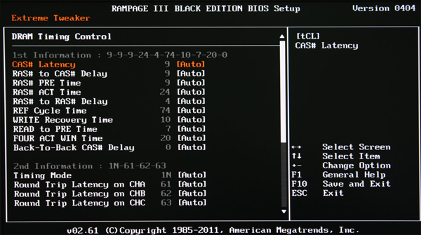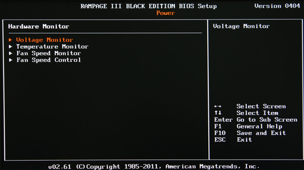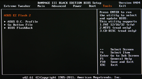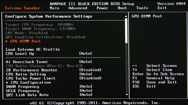 Раз уж ASUS Rampage III Black Edition рассчитана прежде всего на энтузиастов, то и всё внимание в BIOS сосредоточено на оверклокерских функциях. Все лишние «красивости» отсюда исключены. В оформлении всё просто: чёрный фон, яркий шрифт (белый, оранжевый или серый).