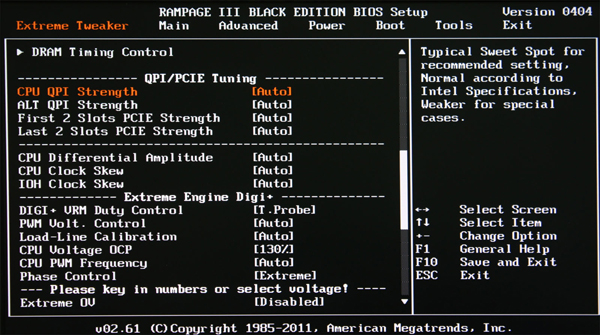 По уже сложившейся традиции самым первым разделом в меню BIOS является раздел Extreme Tweaker. Параметры, доступные к изменению в этом разделе, в основном повторяют те настройки, что присутствовали в BIOS Rampage III Extreme, однако есть и новые пункты, ранее недоступные ни на одной плате ASUS. В первую очередь эти настройки затрагивают режим работы контроллера памяти. В подразделе QPI/PCIE Tuning появились опции CPU QPI Strength и ALT QPI Strength. Отвечают эти функции за тонкую настройку мощности сигнала контроллера QPI. На выбор доступны следующие опции: