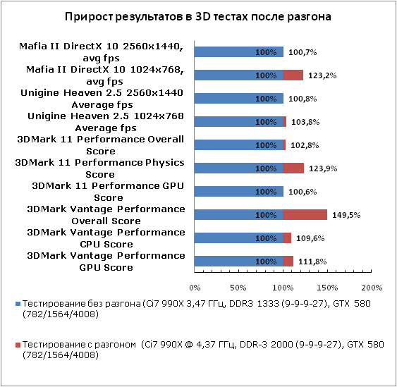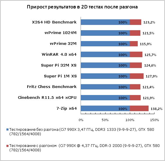 В то же время 2D-тесты приходят в восторг от разгона процессора и памяти. В некоторых случаях прирост составляет около 40%, хотя чаще всего изменение результатов пропорционально росту тактовой частоты процессора.
