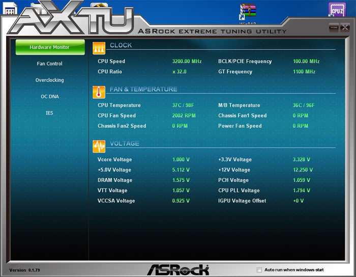 На базе этой функции программисты ASRock написали утилиту OC DNA, которая позволяет оперировать профилями как файлами (то есть можно послать профиль по почте, выложить в Интернет и так далее). Причем в ASRock пошли по стопам ASUS и объединили все мелкие утилиты в одну большую, под названием ASRock Extreme Tuning Utility. С помощью этой программы можно разгонять систему (об этом чуть позже), осуществлять системный мониторинг и управлять вентиляторами, а также экономить электроэнергию с помощью технологии ASRock I.E.S. (Intelligent Energy Saver). Вот так выглядит утилита Extreme Tuning Utility, а именно раздел системного мониторинга: