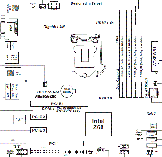 При разработке платы Z68 Pro3-M инженеры компании ASRock использовали немало уже испробованных ранее наработок. В частности, за основу был взят дизайн PCB платы H67M-GE с чипсетом H67. В результате, благодаря принадлежности чипсетов к одному семейству, объем изменений (и, соответственно, инженерной работы) был сведен к минимуму.