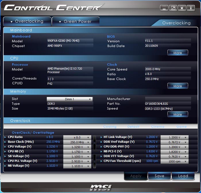 С платой MSI 990FXA-GD80 пользователю не придется вникать во все тонкости оверклокинга — достаточно нажать на кнопку OC Genie, и плата самостоятельно разгонит процессор, при адекватной гарантии стабильной работы. В нашем случае разгон процессора AMD Phenom II X3 720 (штатная частота 2,8 ГГц, 14х200) дает пользователю лишние 490 МГц тактовой частоты.