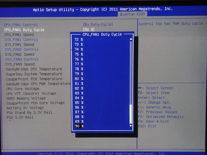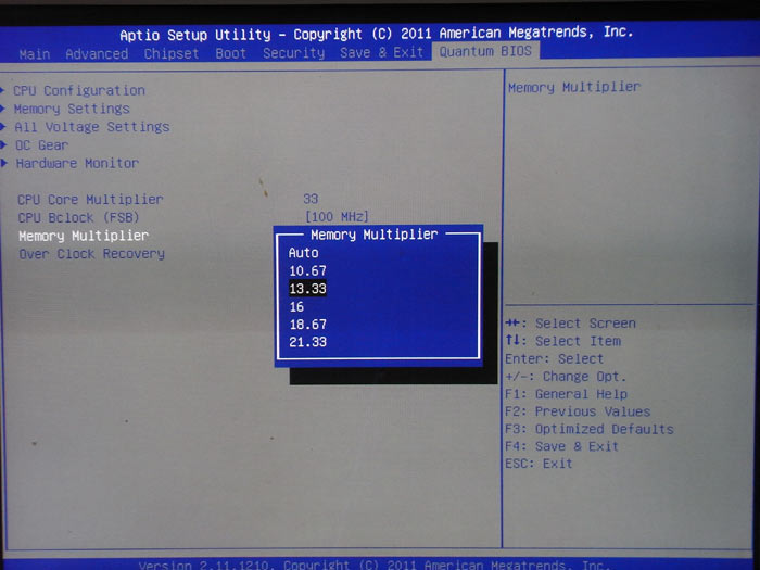Включение режима разгона происходит после нажатия клавиши OC. Затем при помощи остальных двух кнопок пользователь может повышать и понижать частоту Bclk на 1 МГц. На наш взгляд, данное техническое решение нельзя назвать идеальным. Намного удобнее было бы изменение как множителя процессора, так и частоты Bclk. Выбор режима осуществлялся бы той же кнопкой OC, у которой есть два положения. Также шаг, равный 1 МГц, слишком большой для платы на чипсете P67 из-за очень малого диапазона изменения этой частоты. Шаг 0,2 МГц был бы более уместным.