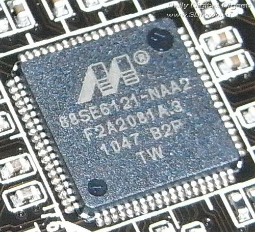 Также плата поддерживает два канала SerialATA 3 Gb/s с помощью дополнительного контроллера Marvell 88SE6121. Соответствующие порты выведены на заднюю панель.