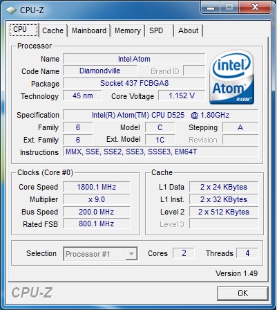 | Процессор | DualCore Atom D525 (1,8 ГГц); Поддержка технологии Intel HyperThreading |