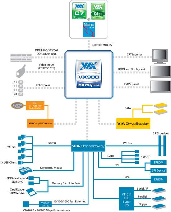 Кроме этого, отметим, что чипсет VX900 может быть соединен с тремя основными семействами процессоров VIA (С7, Eden и Nano) через шину FSB с частотой 400 или 800 МГц. Чипсет имеет одноканальный универсальный контроллер памяти с поддержкой двух слотов. Универсальность контроллера проявляется в том, что он поддерживает как память DDR2 (максимальная частота DDR2-667), так и память DDR3 (DDR3-1066 соответственно). Одноканальность — это не лучшее техническое решение для встроенного графического ядра, но в данном сегменте двухканальный доступ можно найти только у чипсета NVIDIA ION.