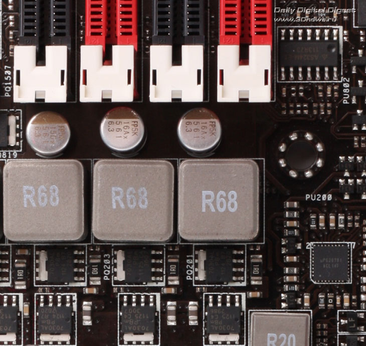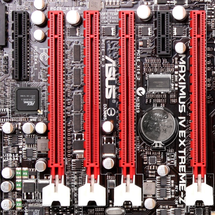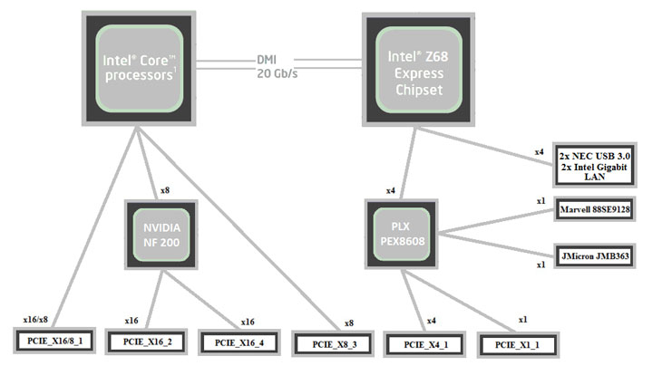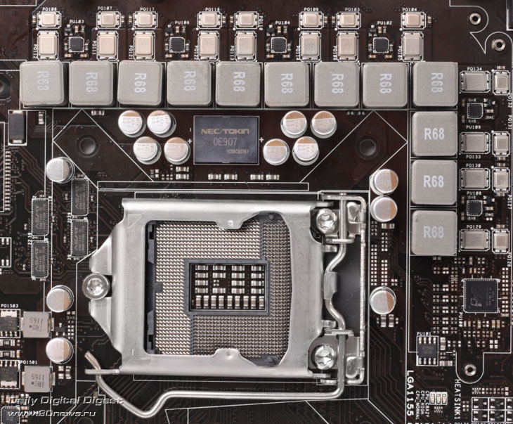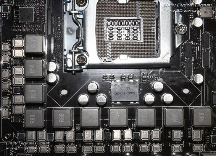 ⇡#Внешний вид и системная логикаПереходя к описанию самой материнской платы, первым делом обратим внимание на её внешний вид. Плата собрана на черном текстолите под глянцевым лаком, на котором расставлены чёрно-красные элементы компоновки и твердотельные конденсаторы с металлическим отблеском. Словом, плата оформлена в строгом соответствии с канонами серии ROG. Более того, по дизайну и компоновке она практически полностью повторяет Maximus IV Extreme. И это не случайно, ведь по сути наша подопытная и есть ремейк представленной в начале текущего года материнской платы Maximus IV Extreme, с одним существенным изменением — место чипсета Intel P67 занял PCH Intel Z68. Описание системной логики Intel Z68 мы уже проводили в одной из наших статей, посвящённой материнской плате Gigabyte GA-Z68X-UD5-B3, однако ещё раз остановимся на основных моментах. Чипсет Intel Z68 относится к тому же семейству Cougar Point, что и наборы микросхем P67 и H67, поэтому каких-либо архитектурных различий просто нет. По-прежнему отсутствует «нативная» поддержка портов USB 3.0, которая появится лишь в системной логике под грядущий процессорный разъём LGA 2011. Не изменилось и количество линий PCI-e (восемь), которые реализуются чипсетом в дополнение к шестнадцати линиям PCI-e, обеспеченным системным агентом процессоров Sandy Bridge. Однако не всё так «безрадостно», конечно же, присутствуют и нововведения. Чипсет Z68 исправляет «ошибку» маркетингового разделения чипов H67 и P67 (первый из которых позволял использовать встроенное в процессор видеоядро, а второй — изменять множители процессоров серии «K» для достижения разгона), теперь все преимущества этих чипов доступны с одной системной логикой. Также новая системная логика позволяет реализовать две программные технологии. Одна из них носит название Virtu, разработкой оной занималась небезызвестная своими «графическими экспериментами» компания Lucidlogic. Технология позволяет задействовать встроенное в процессоры Sandy Bridge графическое ядро при одновременном использовании дискретной видеокарты, что в свою очередь делает возможным использование технологии Intel Quick Sync (аппаратное кодирование и декодирование видеопотока), которая так «бездарно простаивала» с набором микросхем P67. Вторая технология, которая носит название Intel Smart Response, представляет собой особый режим работы RAID-контроллера, позволяющий собрать массив одновременно из HDD- и SSD-накопителей. SDD-диск в данном случае служит высокоскоростным энергонезависимым кешем большого объёма, при этом ёмкость массива соответствует ёмкости HDD-накопителя. По сути — некое подобие гибридного диска от Seagate. Как видно из тестирования, которое мы проводили в статье, посвящённой всё той же материнской плате Gigabyte GA-Z68X-UD5-B3, такой подход не всегда дает желаемый результат, выигрыш в производительности чаще всего наблюдается в часто повторяющихся операциях с магнитным диском, что, впрочем, вполне закономерно. Если технологией Intel Smart Response на материнской плате ASUS Maximus IV Extreme-Z можно воспользоваться в полной мере, для этого необходимо всего лишь установить драйвер Intel Rapid Storage Technology 10.5, то «по полной» применить Virtu на этой плате не удастся. Это связано с отсутствием на материнской плате какого-либо видеовыхода. И сделано это именно из соображений экономии, поскольку разработка нового дизайна — не очень выгодное занятие, притом что в линейке уже суще