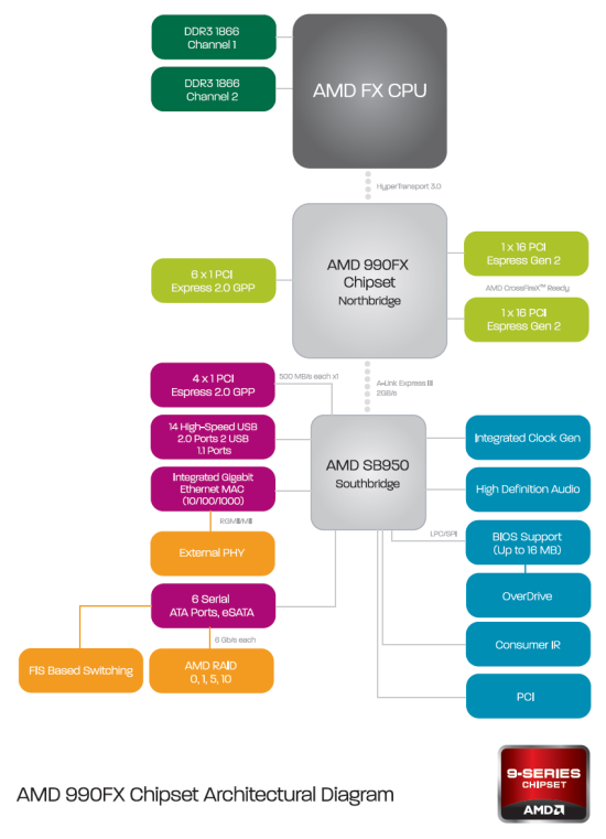 AMD 990FX является старшим из трёх чипсетов (точнее — трёх их северных мостов, поскольку все три чипсета используют один и тот же «южник» SB950) новой платформы Scorpius. Он, как и остальные чипсеты этой серии — 990X и 970, рассчитан на новый разъём Socket AM3+, содержащий на один контакт больше, чем AM3, но тем не менее полностью совместимый с прежними процессорами под AM3. Впрочем, отличия чипсетов AMD 900-й серии от 800-й чисто косметические (и касаются почти исключительно новых сигналов сокета AM3+), по интерфейсам же ничего нового нет. Так, чипcетом 990FX поддерживаются 42 линии шины PCI Express 2.0, причём графические слоты можно организовать по принципу 2x16, 4x8 или 1х16+2х8, объединяя их как в CrossFireX, так и (ура, наконец-то!) в SLI (появление официальной поддержки SLI — едва ли не единственное полезное отличие 990FX от 890FX). Кроме того, северный мост 990FX имеет ещё 6 линий PCI Express общего назначения, а «южник» — ещё четыре линии PCIe (все — версии 2.0). Южный мост SB950 (близнец моста SB850) оснащён шестью портами Serial ATA 6 Гбит/с с функциями массивов RAID 0, 1, 5 и 10, а также 14 портами USB 2.0 (посетуем на отсутствие здесь поддержки USB 3.0, уже имеющейся в более дешёвых решениях для AMD Socket FM1). Туда же интегрирован MAC гигабитного сетевого контроллера (требуется только внешний PHY), контроллер шины PCI, HD Audio, тактовый генератор и пр. Тепловыделение (TDP) нового чипсета AMD 990FX составляет немалые нынче (если вспомнить одночиповые решения от Intel) 25,6 Вт.