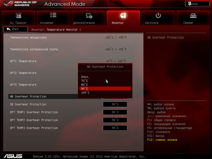 а также температура пяти точек (три из них — при помощи приобретаемых отдельно внешних термисторов), причем для них можно задавать предельно допустимое рабочее значение в диапазоне от +70 до +100 градусов Цельсия.
