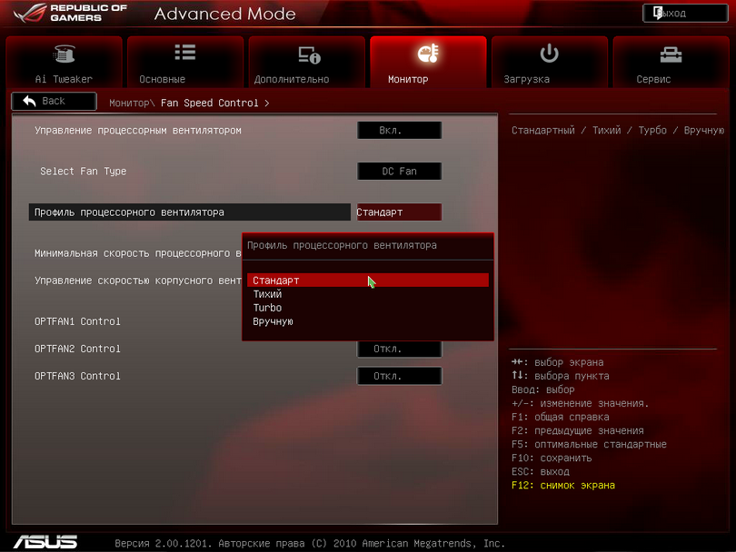 Управление скоростью вращения «карлсонов» реализовано в отдельном пункте меню и лишь для пяти вентиляторов (вернее, шести, поскольку два процессорных управляются синхронно). Для процессорного кулера можно выбрать тип управления (PWM, то есть широтно-импульсной модуляцией, или DC, то есть напряжением питания) и степень регулировки (три предустановки или вручную, см. скриншот выше), причем с отдельным заданием минимальной скорости вентилятора. Для корпусного вентилятора (уже без возможности PWM-управления) тоже допустимы три предустановки или ручная регулировка, а также задание минимальной скорости.