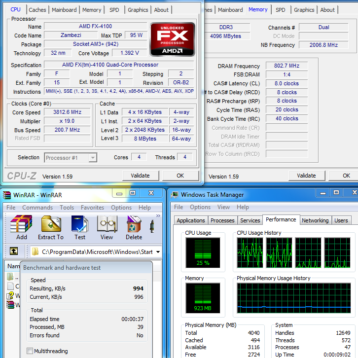 Наша тестовая память на этой плате с процессором FX 4100 без каких-либо усилий заработала на частоте 2400 МГц при повышении напряжения её питания до 1,80 В со штатных для неё по X.M.P. +1,65 В. Правда, производительность системы даже в приложениях, гиперчувствительных к скорости памяти (как, например, встроенный бенчмарк WinRAR), увеличилась едва заметно, сравните показания на скриншотах выше и ниже.