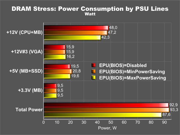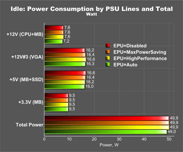 Здесь уже чётко видно, что один из режимов EPU (с максимальным энергосбережением) на 5-6 Вт экономичнее остальных. Причем экономия приходится только на 12-вольтовую линию питания процессора от «материнки». Важно ли это пользователю в реальной работе? Думаю, каждый решит для себя сам.