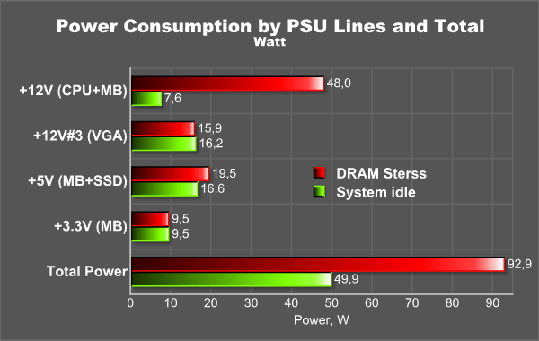 Потребление платы с процессором, памятью и видеокартой измерялось нами в двух режимах: