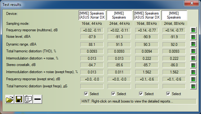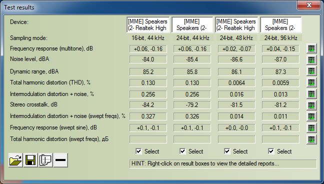Сводные результаты теста линейного аудиовхода платы представлены на двух следующих скриншотах.