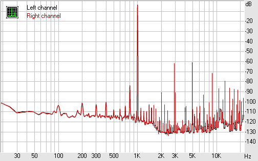 Наиболее качественными, как ни странно, оказались режимы с частотой 44,1 кГц, поскольку в остальных случаях неприлично резко возрастали искажения сигнала, гармонические и интермодуляционные, а также немного «заваливалась» АЧХ. В целом работу входа при 44,1 кГц (16 и 24 бит) программа RMAA оценила на четверочку (искажения на уровне 0,01%, шумы около -90 дБА), а в других режимах некоторым параметрам были даны оценки «средне» и «плохо» (и они сильно портят общую картину). Впрочем, профессиональный режим 24 бит 96 кГц также оказался неплох (на уровне 24/44 по качеству) за исключением втрое более высоких интермодуляционных искажений. Режимы же с частотой 48 кГц здесь использовать мы вообще не рекомендуем из-за неприлично высоких искажений (очевидно, из-за неправильной обработки сигнала), см. график: