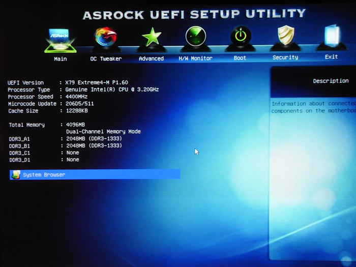 Материнская плата X79 Extreme4-M поддерживает интерфейс UEFI с очень удобной графической оболочкой, которая уже хорошо знакома нашим читателям. Причем программисты ASRock выбрали очень правильный путь для улучшения интерфейса: местоположение всех основных групп настроек остается без изменений, а мелкие изменения предназначены исключительно для наведения глянца. Таким образом, пользователь, уже знакомый с платами ASRock, без труда найдет нужный ему раздел и очень быстро настроит систему.