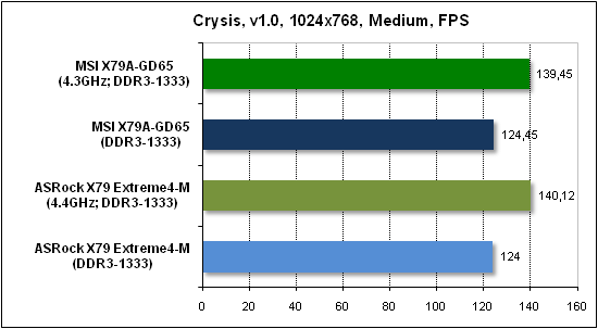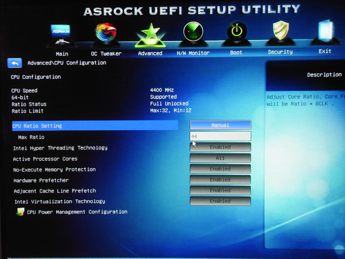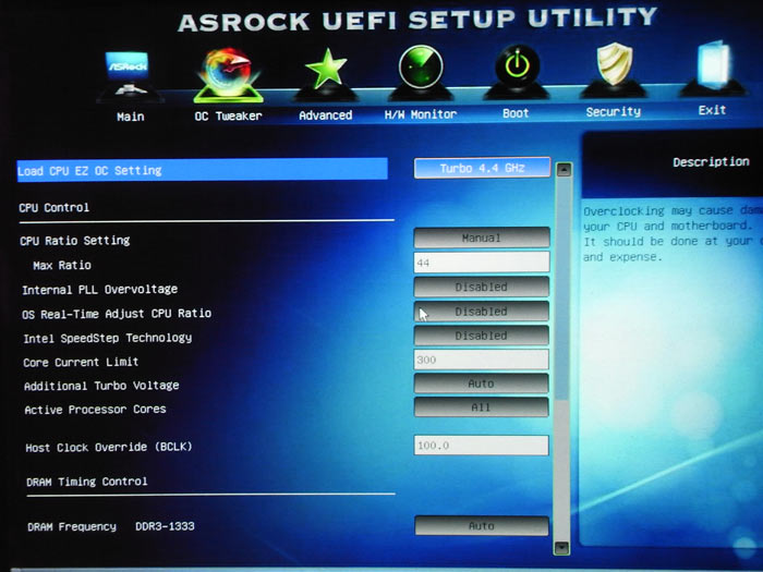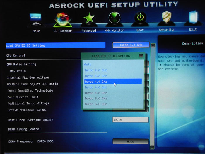 Практический разгон процессоров на тестовой плате оказался нелегким делом. Так, при ручной установке множителя процессора вне зависимости от выбранного значения плата принудительно устанавливала его равным 39. Учитывая, что данный экземпляр процессора имеет стабильный диапазон рабочих частот 4,4-4,5 ГГц, указанный недостаток не дает пользователю выжать максимум пользы из CPU. Очень странно видеть подобную ошибку на вполне зрелой прошивке BIOS (версия 1.60). Впрочем, потенциал у платы есть, так что можно воспользоваться функцией CPU EZ, которая отвечает как за установку множителя процессора, так и за второстепенные параметры.