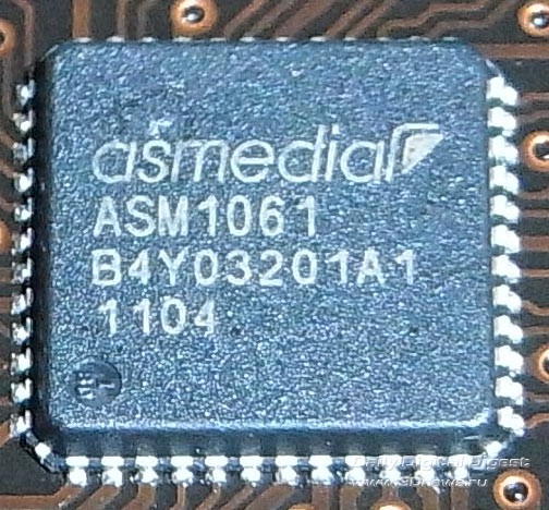 Кроме этого, на плате установлен дополнительный контроллер ASMedia ASM1061, который поддерживает два канала SerialATA 6 Gb/s. Один соответствующий порт установлен около чипсета, а другой выведен на заднюю панель платы.