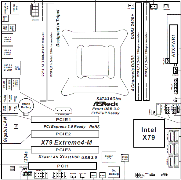 Материнская плата ASRock X79 Extreme4-M отличается уменьшенным (до четырех) количеством слотов DIMM, что соответствует концепции малогабаритной системы. Впрочем, технических ограничений на установку восьми слотов на Micro-ATX-форм-факторе нет, хотя это приводит к неоправданному усложнению дизайна PCB.