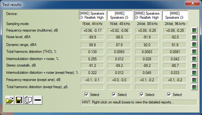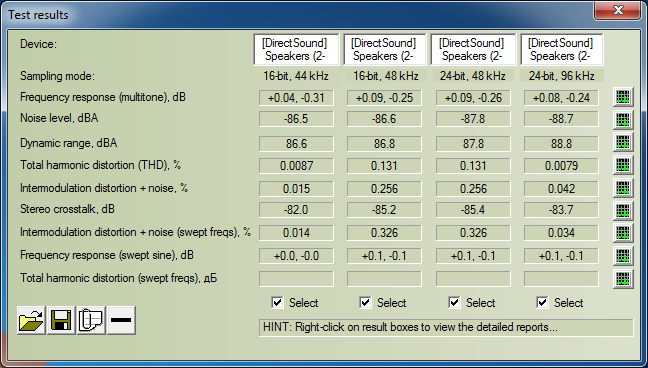Посмотрим, так ли это на самом деле. Напомню, что измерения мы проводим при помощи аудиокарты с собственными шумами на выходе/входе, равными -116/-112 дБА, и искажениями сквозного тракта около 0,001%.