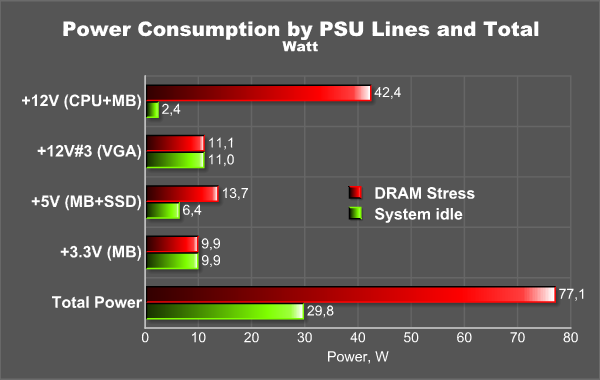 В состоянии ожидания (Рабочий стол Windows) среднее потребление этой платы с ЦП составило примерно 30 Вт, из которых 11 Вт забирала видеокарта по своей линии +12 В.
