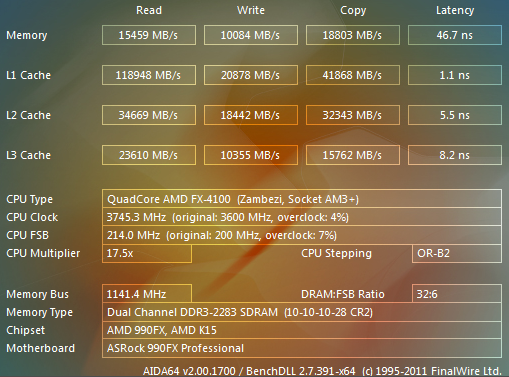 При разгоне памяти на ASRock Fatal1ty 990FX Pro пришлось повозиться с таймингами — в отличие от плат ASUS, она не поднимает их автоматически с ростом частоты, а при CL=11 (и выше) плата почему-то вообще не работала, поэтому пришлось остановиться на CL=10. При таймингах 10-10-10 (и напряжении на памяти +1,8 В) нашим модулям на этой плате покорилась частота 2283 МГц (против 2400 МГц на ASUS CVF):