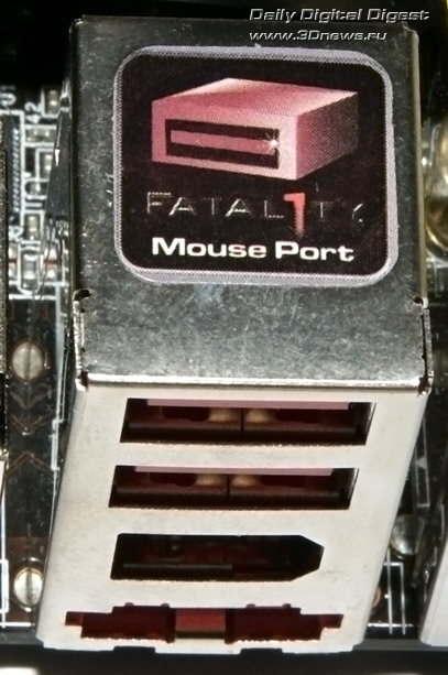 В-пятых, эта плата ASRock куда более насыщена разъёмами на задней панели, чем решение от ASUS. Да, портов USB здесь меньше, зато есть FireWire, причем на PCIe-контроллере VIA VT6315N (у ASUS CVF вообще нет IEEE1394!), второй гигабитный сетевой порт (у CVF лишь один) с удвоением скорости сетевой работы (Teaming) и существенным снижением лагов (что важно в сетевых играх; технология XFast LAN), а также выделенный электрический выход S/P-DIF и два порта eSATA (против одного у ASUS CVF). Плюс отдельный разъём PS/2 для любимой «бывалой» игровой мышки. Плюс специальный USB-порт Fatal1ty Mouse Port, позволяющий при помощи технологии ASRock F-Stream использовать повышенную частоту опроса мышки (250, 500 или 1000 Гц), что очень полезно в кибербаталиях.