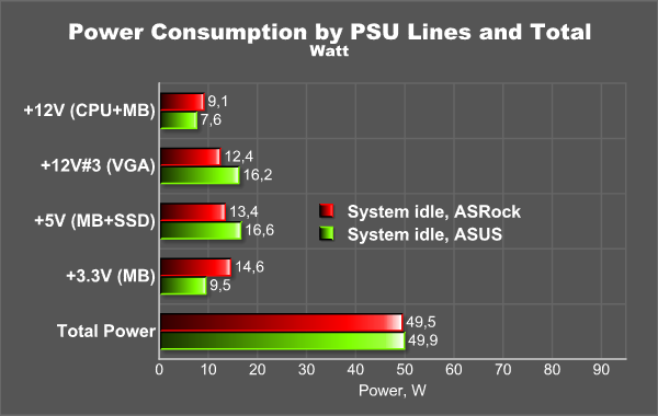 В состоянии ожидания («Рабочий стол» Windows) среднее потребление платы ASRock примерно такое же, как у ASUS CVF (около 50 Вт с AMD FX 4100 и Radeon HD 6970), хотя нагрузка немного по-иному распределена по линиям питания: