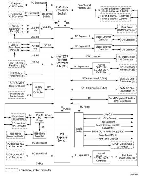 8 линий PCIe 2.0 от чипсета Z77 распределены следующим образом (см. блок-схему): 4 линии идут напрямую на слот PCI Express x4, пара — на контроллеры GbE, одна — на чип Marvell 88SE9172 (2 внутренних SATA) и ещё одна — на 6-канальный коммутатор шины PCI Express на чипе PLX PEX8606.