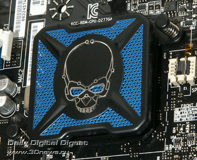Плата имеет традиционный для «экстремамок» Intel стильный чёрно-синий дизайн с «фирменным» зловещим черепом на крышке небольшого радиатора чипа Z77 (его TPD = 6,7 Вт). «Красивые глаза» черепа здесь, впрочем, не мигают, как бывало ранее на некоторых других интеловских «экстремамках». А жаль. Зато эта плата оснащена целым созвездием индикаторов, на фоне которых даже самые зловещие красные глазницы черепа смотрелись бы «лузово».