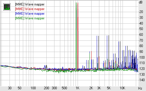 Если же частота дискретизации сигнала не совпадает с рабочей частотой входа или выхода аудио (например, одна — 44,1 кГц, а другая — 48 кГц), то сразу же появляются существенные искажения сигнала — до 0,13% по гармоническим и до 0,26% по интермодуляционным:
