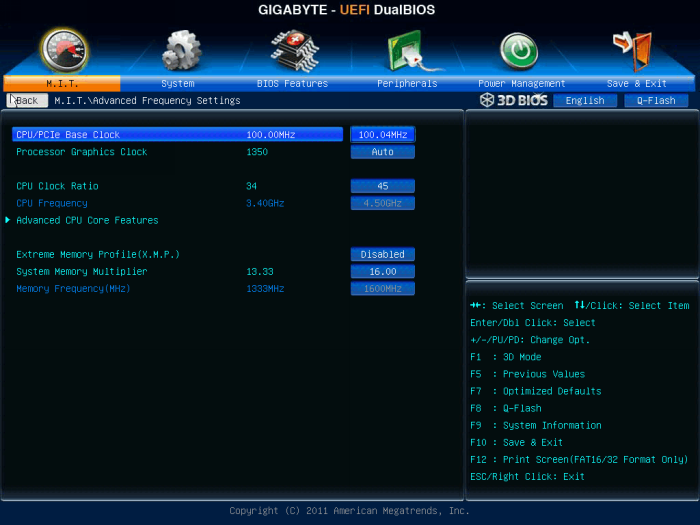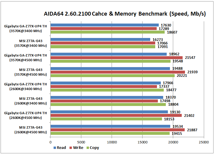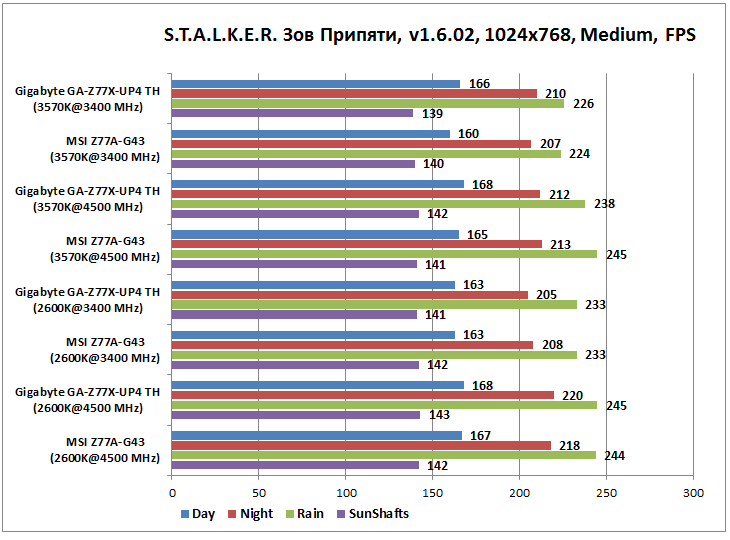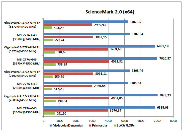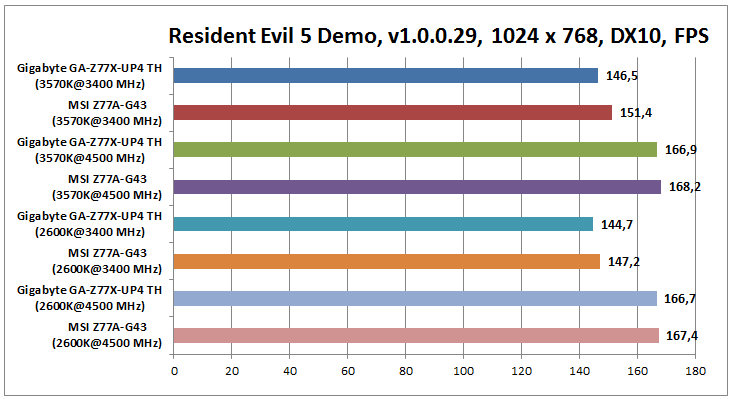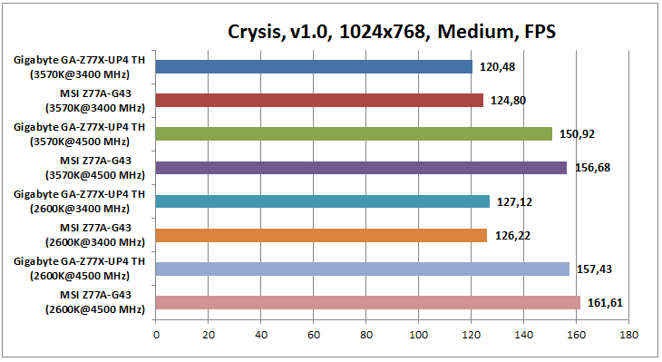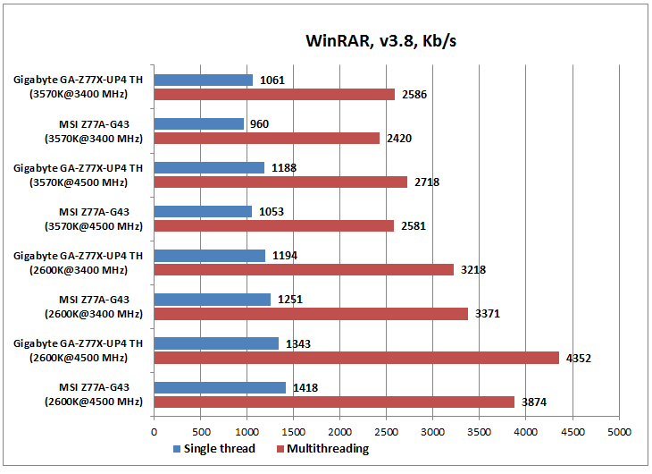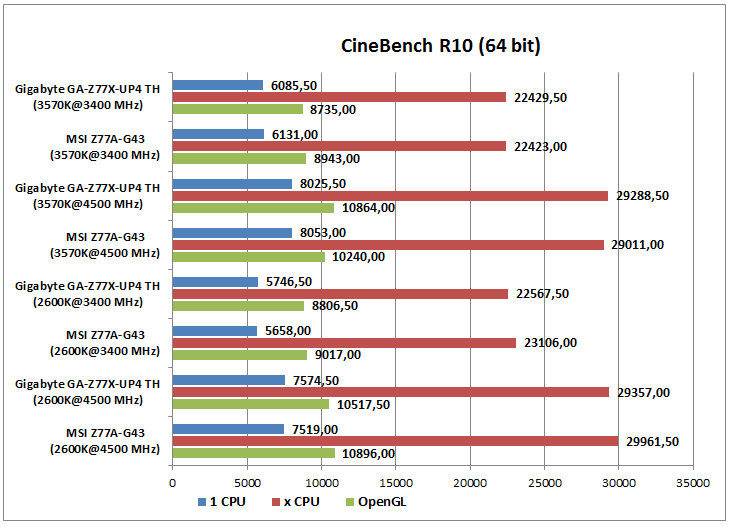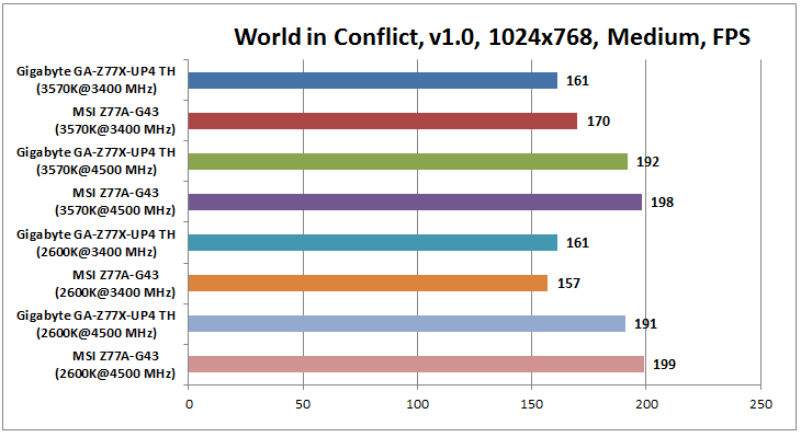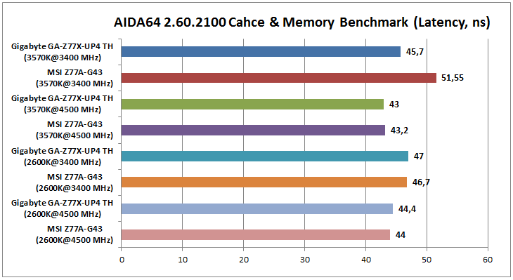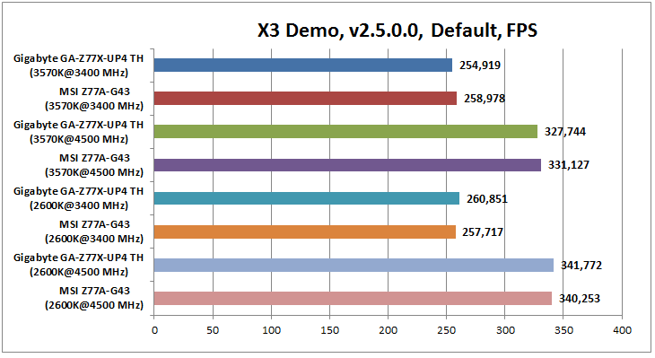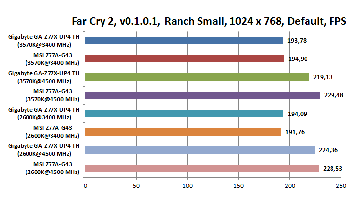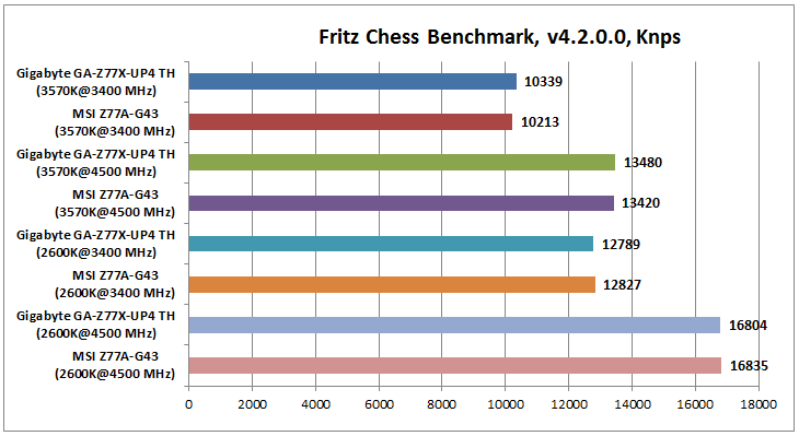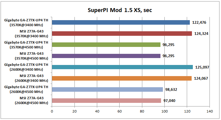 По умолчанию частота BCLK составила 99,8 МГц. Для объективного сравнения с MSI Z77A-G43 на обеих платах частота BCLK в BIOS была выставлена таким образом, чтобы в результате получалось ровно 100 МГц. Для Gigabyte эта частота составила 100,04 МГц, для MSI — 100,01 МГц. Чтобы исключить влияние различного поведения плат в «турборежиме», множители ядер были зафиксированы на 34. В режиме разгона значение множителей ЦП было установлено на 45.
