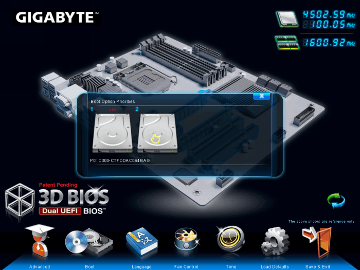 Сильно ограничив количество настроек «трехмерной» реализации интерфейса, Gigabyte явно разделяет пользователей на категории. Настроить порядок загрузки удобнее в «простом» режиме, перетянув мышью иконки дисков так, чтобы они расположились в нужном порядке. Тут же проще выбрать основные тайминги памяти и коэффициент умножения частоты процессора.