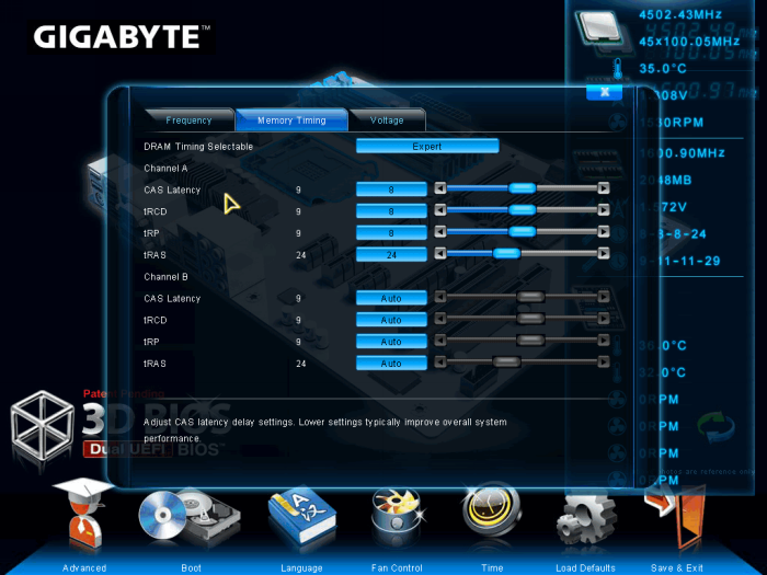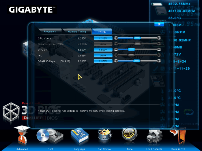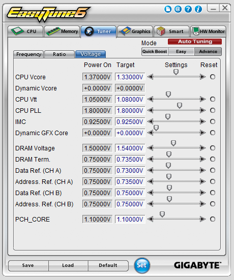 На соответствующих вкладках Easy Tune есть возможность изменить множитель ЦП и те же напряжения, которые можно устанавливать в BIOS. Для второстепенных напряжений памяти (здесь передаем привет BIOS) есть возможность выставить одинаковые значения.