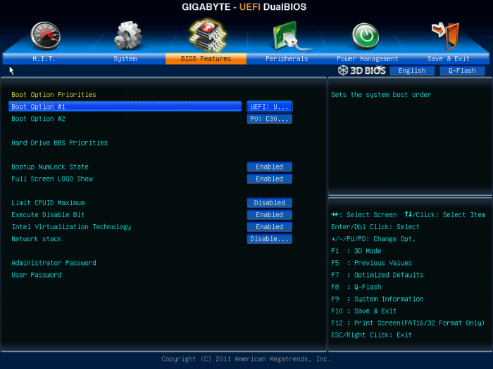 BIOS Features позволяет настроить общий порядок загрузки, а также расставить приоритеты среди дисков, дисководов и устройств, позволяющих загружаться по сети. Здесь же можно выбрать начальное состояние Num Lock и включение/отключение полноэкранной заставки материнской платы (отключать ее не имеет смысла, так как кроме логотипа AMI ничего при загрузке выводиться не будет). Кстати, информация, обычно выводимая в POST, доступна при нажатии клавиши F9. Далее следуют упомянутые выше настройки процессора, которые логично было бы положить куда-нибудь в раздел M.I.T. Чуть ниже можно разрешить загрузку по сети, причем сделать это можно отдельно для протоколов IPv4 и IPv6. Наконец, можно задать пароли пользователя и администратора, чтобы разграничить доступ к настройкам материнской платы.