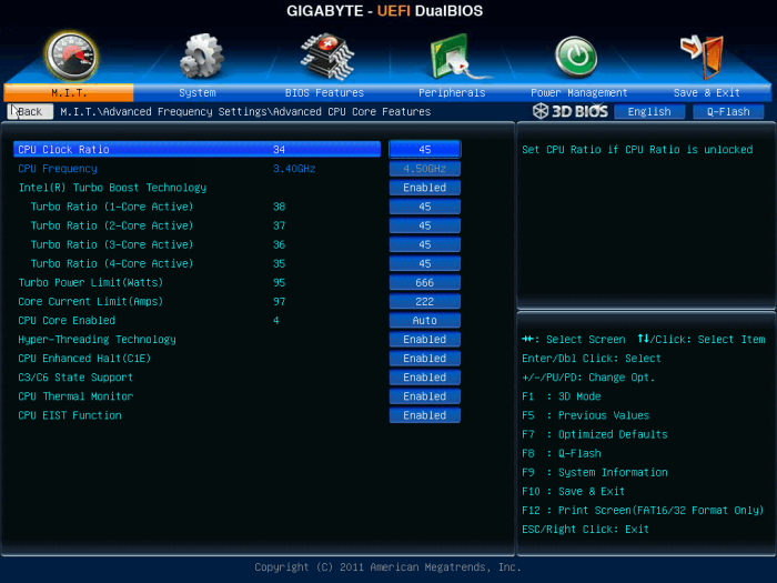 Advanced Frequency Settings включает в себя еще один подраздел, в котором можно выбрать множители процессора по ядрам для «турборежима», а также умерить аппетит ЦП, введя ограничение в ваттах или амперах. Довольно странно было увидеть в разделе, именуемом «настройки частот», выбор количества ядер и специфичных функций вроде Hyper-Threading. Ладно, раз уж разместили их здесь, соберите весь набор — привычных соседей (Limit CPUID, execute disable bit и Intel virtualization) здесь нет. Они переехали на вкладку BIOS Features. Где логика, господа?
