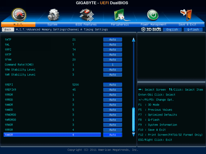 Непосредственный доступ к изменению таймингов можно получить, выбрав Channel A Timing Settings или Channel B Timing Settings. Помимо четырех основных задержек, изменить можно более двух десятков второстепенных — довольно большой задел для любителей особо тонкой подстройки. В ходе тестирования материнской платы была выявлена интересная особенность разделения настроек каналов: добавление третьего модуля в Channel B показало, что тайминги на нем были выставлены материнской платой самостоятельно. Переключение из Expert в Quick и обратно с ручным выставлением задержек для нового модуля не дало результатов. В M.I.T. Current Status было видно, что тайминги остались неподвластными установкам в соответствующем разделе. AIDA64 это мнение разделяла. Чтобы ликвидировать данное досадное недоразумение, из «канала А» были вынуты оба модуля. Увидев, что новая планка памяти осталась в гордом одиночестве, материнская плата незамедлительно применила к ней выставленные тайминги. Возвращение коллег не заставило ее пересмотреть решение, и тайминги в обоих каналах приняли одинаковые значения, что было видно и в BIOS, и в ОС — все в той же AIDA64. CPU-z во всех случаях отображал лишь задержки первого канала. При использовании BIOS версии F9 таких недоразумений не случалось.