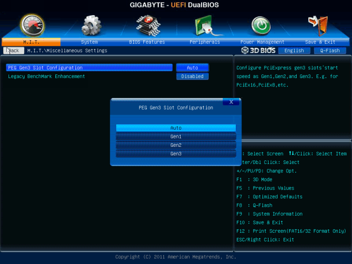 Остался подраздел Miscellaneous Settings, содержащий всего две строки: PEG Gen 3 Slot Configuration и Legacy BenchMark Enhancement. Первый пункт позволяет вручную указать, в каком из режимов функционировать PCI-e x16 портам (Gen 1, Gen 2 или Gen 3), второй может повысить производительность в некоторых старых бенчмарках.