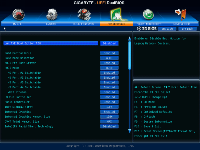 Следующая вкладка — Peripherals — позволяет осуществлять контроль над всеми контроллерами, расположившимися на материнской плате. LAN PXE Boot Option ROM позволяет включить возможность загрузки по сети для встроенного адаптера. Также здесь можно отключить контроллер SATA (единственный на этой плате, но такова плата за универсальность кода) и выбрать режим работы этого интерфейса. Далее идет группа опций, отвечающих за совместимость USB 3.0 портов со старыми устройствами. В частности, можно принудительно заставить этот интерфейс работать как USB 2.0 до загрузки операционной системы или доверить выбор автоматике. При подключении совместимого с новым стандартом устройства маршрут будет изменен с EHCI на xHCI. Среди них же можно включить поддержку многопоточности для USB 3.0.