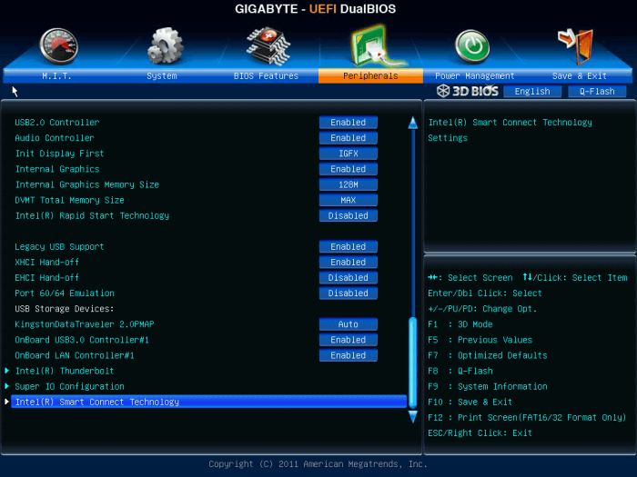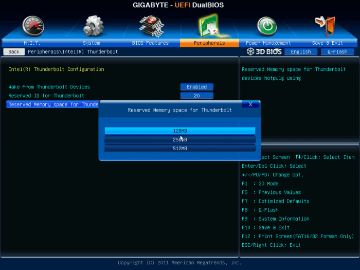 Для Thunderbolt выделили специальный подраздел. В нем можно, во-первых, разрешить пробуждение от устройств, подключенных к этому интерфейсу. Во-вторых, увеличить количество последовательно подключенных к портам устройств. Значение по умолчанию позволяет задействовать не более трех устройств в цепи, а чтобы иметь возможность соединить друг с другом максимально допустимые шесть железок, нужно увеличить его до 48K. Если бы материнская плата имела дополнительный контроллер SATA, он отключился бы, так как существует ограничение на ресурсы ввода вывода, но в нашем случае он отсутствует. В самой новой версии BIOS F9 появилась возможность выбрать, сколько памяти выделить новому интерфейсу. Микропрограмма версии F3 подобной возможностью не обладала (видимо, использовалось значение 128 Мбайт).