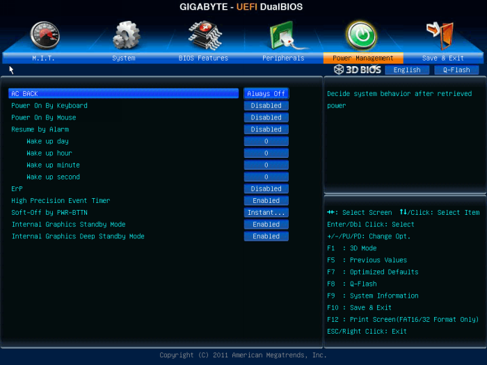 Перейдем к небольшой, но важной вкладке Power Management. Здесь можно настроить автоматическое включение ПК в заданное время, выбрать реакцию на восстановление питания, разрешить включение при помощи мыши и/или клавиатуры. ErP позволяет значительно понизить потребление энергии в состоянии S5 (shutdown), платой за это будет невозможность включиться по сигналу от мыши, клавиатуры или сетевого адаптера. Тут же можно включить высокоточный таймер, настроить поведение системы при нажатии на кнопку питания, а также разрешить отключать встроенную графику для экономии энергии.
