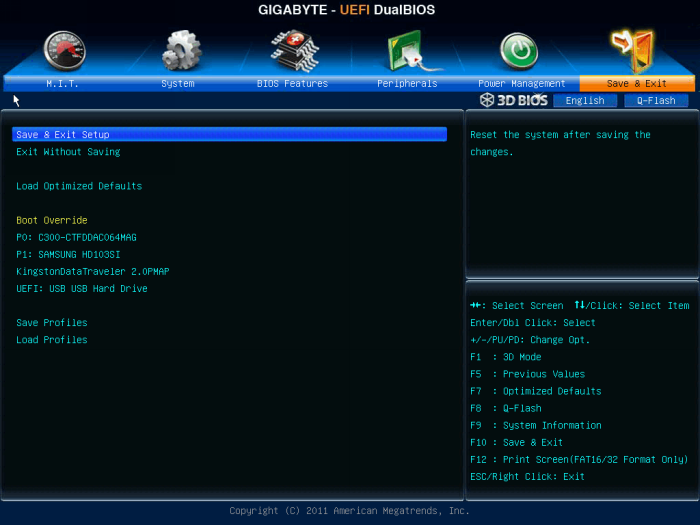 Наконец, мы дошли до последней вкладки, именуемой Save & Exit. Если по какой-то причине вам не нравится нажимать F10 для того чтобы сохранить настройки и перезапустить систему, вы можете сделать это здесь. Также можно выйти без сохранения — в данном случае начнется загрузка операционной системы (без лишней перезагрузки ПК). Те, кому не нравится клавиша F7, в одноименном пункте меню могут сбросить параметры на стандартные. Для тех, кто не желает нажимать F12 при старте системы, чтобы выбрать с чего загружаться, или для тех, кто, бродя по BIOS, вспомнил, что хотел загрузиться с другого носителя, предназначен список Boot Override.