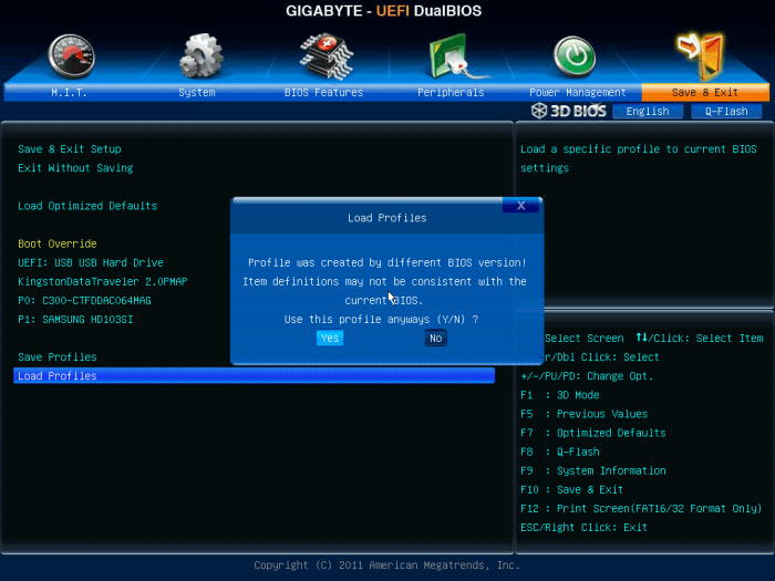 Сохраненные в CMOS профили новый BIOS не увидел, а при загрузке из файла предупредил, что значения, заданные в старой версии микропрограммы, могут не совпасть со значениями новой.