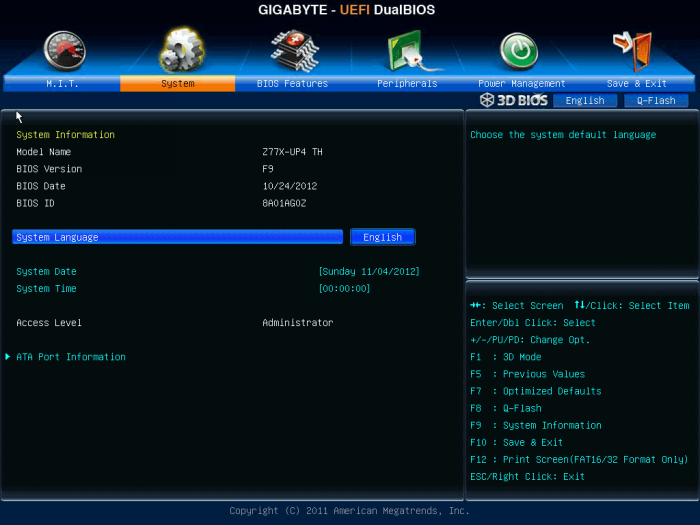 Перейдем ко второй вкладке UEFI BIOS — System. Здесь можно посмотреть название материнской платы, версию и дату выпуска микропрограммы, текущий уровень доступа, список SATA устройств. Из настроек — язык интерфейса, дата и время, запрет/разрешение на работу SATA-портов и включение/отключение возможности горячего подключения накопителей.