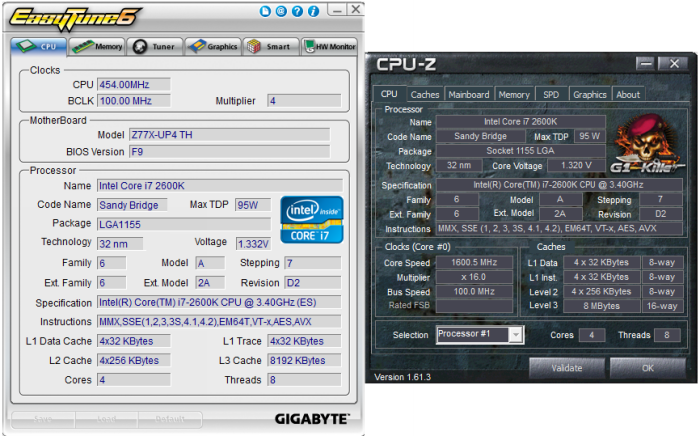 Easy Tune 6 некорректно отображает частоту в простое, но показания Vcore находятся ближе всего к реальным. Также можно доверять программе AIDA64 и специальной версии CPU-z G1 Killer Edition.