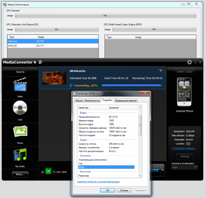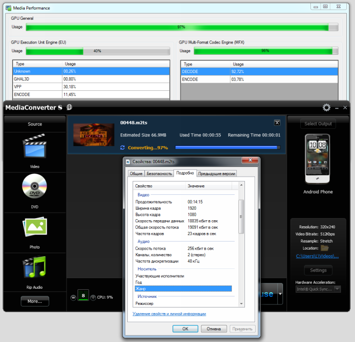 При проверке производительности Full HD-видеофайл с битрейтом 19 Мбит/с (длительность 14 минут 15 секунд, общий размер 1,99 Гбайт) конвертировался в профиль 320x240@512 Кбит/с. Скриншоты сделаны на отметке 97%, чтобы можно было увидеть загрузку встроенного GPU.